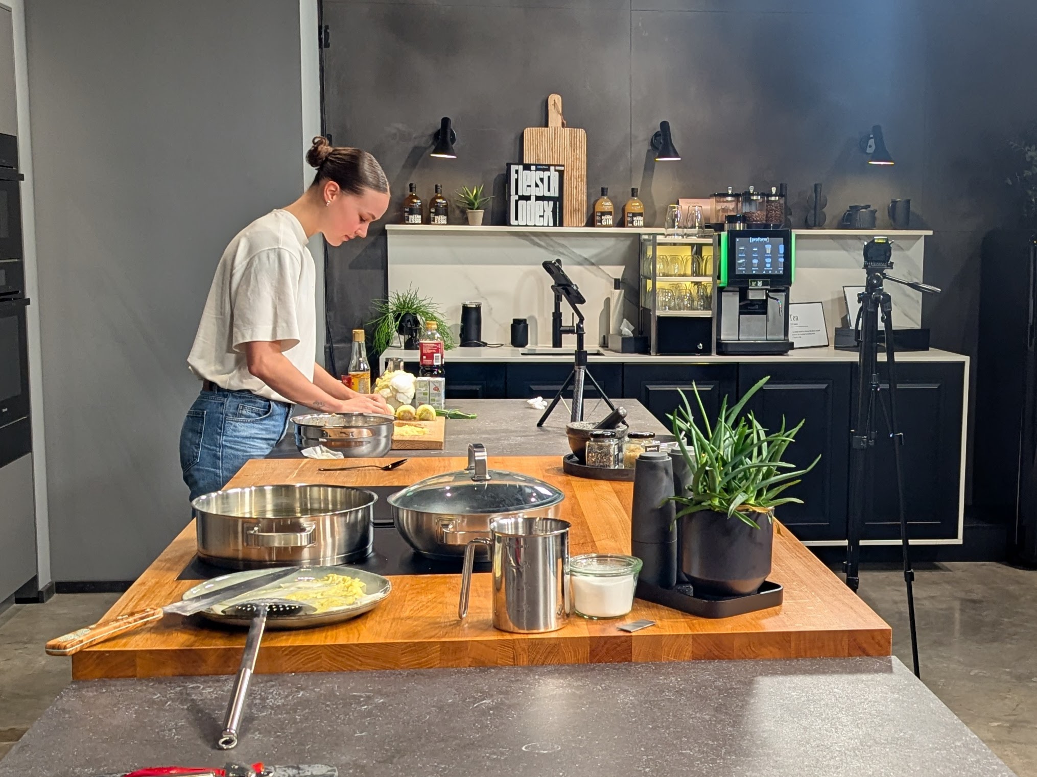 Gegenüber der Bar, noch im vorderen Bereich des Küchenstudios, war am Mittwochvormittag eine Foodinfluencerin konzentriert bei der Arbeit. Sie darf die beleuchtungstechnisch für Bild- und Filmaufnahmen optimierte Ausstellungsküche nutzen, um ihre Kreationen zu inszenieren und dankt es mit einer Verlinkung. Gleichzeitig ist Leben in der Bude.