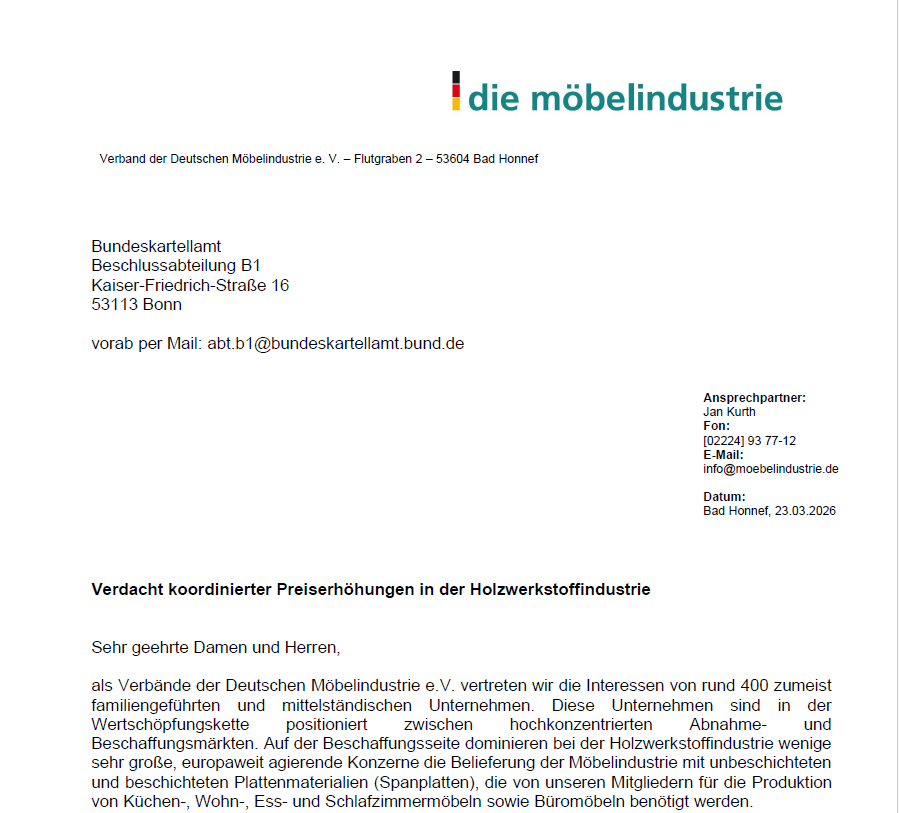 Die Holzwerkstoffindustrie hat Mitte März schon flächendeckend Preisanhebungen angekündigt. Das hat in dieser Woche den VDM auf den Plan gerufen, der wiederum das Bundeskartellamt über einen „Verdacht koordinierter Preiserhöhungen“ informiert hat. |